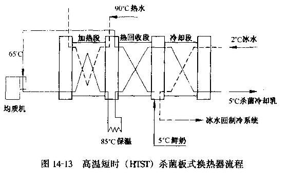 图14-13表示鲜乳的高温杀菌工艺流程。该板式换热器分为三段,热饲收段、杀菌段和冷